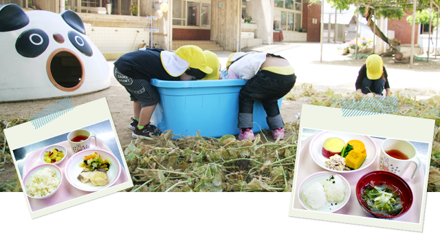 だからこそ、「何を食べるか」だけでなく「いかに食べるか」も大切にします。年齢に応じた調理方法で、3歳児からはなるべく食材本来の形が意識できるように、魚の危険な小骨以外は残します。「どうやって食べるの?」と、保育士と一緒に考えながら、少しずつ上手に食べられるようになります。また風雪の節分の頃には、園庭でいわしの一夜干しをそれぞれに炭火焼き。「このまま外で給食する!」そんなこともあります。こんなふうにさらの給食は、いつも新鮮・安全で、おいしく・楽しく、「いただきます」。